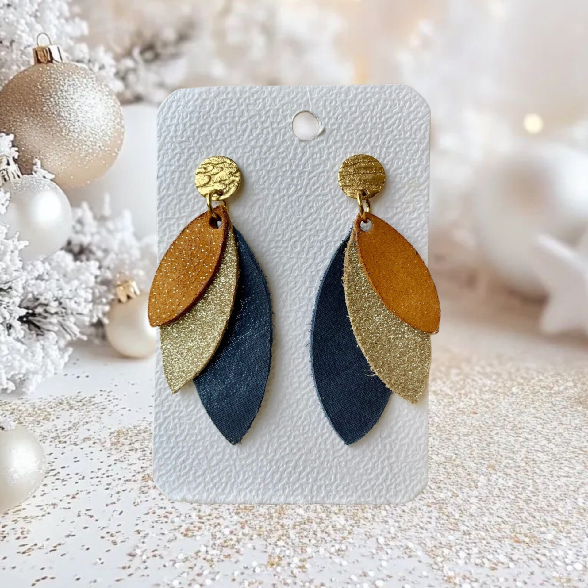 🌟 Boucles d'oreilles en Feuilles Chic - Camel, Bleu & Doré 🌟