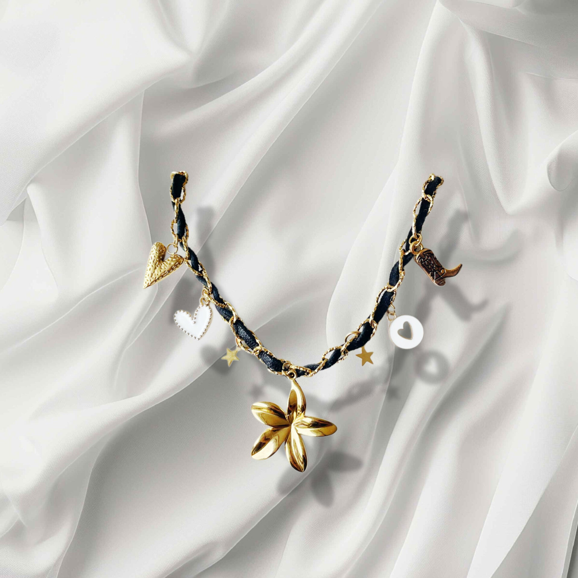 🌟 Sublimez votre look avec ce collier en cuir Noir, orné de charms délicats 🌟