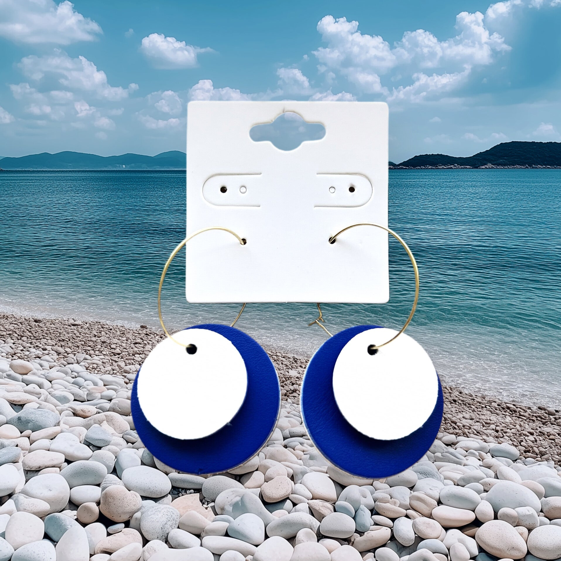 Découvrez notre boucle d’oreille au design moderne et élégant, associant un magnifique bleu profond et un blanc lumineux.